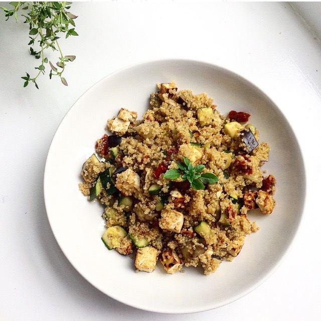 - Once the quinoa is done, stir in the tofu-veg mix and serve garnished with fresh herbs and extra olive oil and balsamic vinegar.