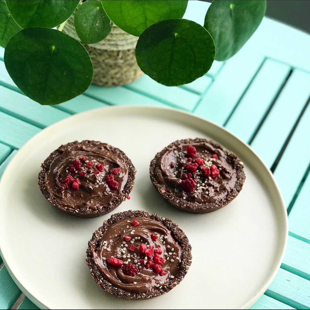 4. Remove the tart dishes from the fridge and evenly distribute the chocolate mousse among them. Optional: Feel free to add a jam or peanut butter layer first, if desired. I found them perfectly indulgent just as they are, but depending on my mood I may try variations in the future. Top with any desired toppings. I simply crumbled some frozen raspberries on top and added some hemp seeds.