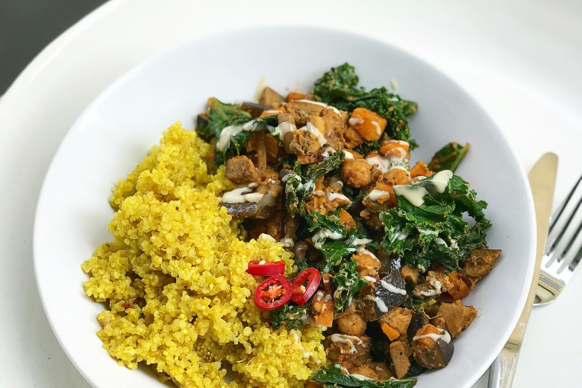 Now that fall has arrived I’m loving cooking warming and slightly heartier dishes, such as this harissa-flavored chickpea stir-fry with mushrooms, kale, aubergine & carrots. I’ve served it with my go-to turmeric quinoa, but you can just as well accompany it with some brown rice, wholewheat pasta, potatoes etc.