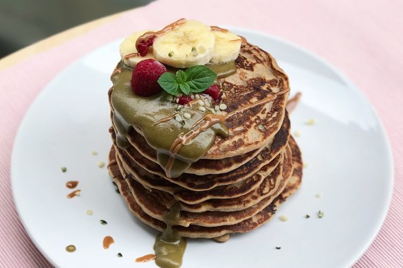 Protein Pancakes with Matcha White Chocolate Sauce